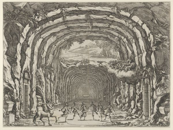 Mathäus Küsel created this print, 'Cavern of Aeolus; a cave with wind gods blowing,' as a set design for the opera 'Il Pomo D'Oro.' It was made using the intaglio technique, where the image is incised into a metal plate, and the recessed lines hold ink, which is then transferred to paper under pressure. The visual texture of the print is striking. Küsel masterfully uses line and hatching to simulate the rough, cavernous space of Aeolus's lair. Look at how the density of the lines creates a sense of depth and shadow, evoking the uneven texture of the rocky walls. The figures are rendered with a precision that contrasts with the wildness of the cave, emphasizing their roles as agents of Aeolus's power. Prints like these were crucial for disseminating theatrical designs, allowing audiences beyond the opera house to experience the spectacle. The labor involved – from the initial drawing to the meticulous engraving – speaks to the value placed on craftsmanship in the 17th century. Appreciating these material and social factors enriches our understanding of the artwork, blurring boundaries between art, craft, and design.