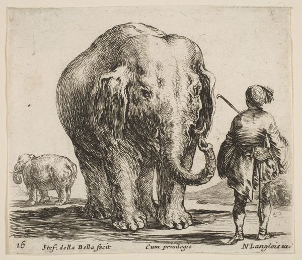 Curator: Immediately I'm struck by this sweet, melancholy air about this rather plump pachyderm! It’s an engraving, a print dating from the 1740s called “En elefant.” Look how it looms on the grass; a really singular focus by Johanna Fosie now residing here at the SMK. What leaps out to you? Editor: The focus is entirely on this specimen, which speaks volumes about eighteenth-century scientific observation and its impact on visual representation. Note the meticulous rendering; it is as much an act of cataloging and possessing as it is art. The work is purely objective. Curator: Possessing, yes, it’s framed rather like a curio isn't it, not just as scientific data, but an object to be studied and enjoyed, back in Europe, as elephants would have still been pretty wondrous! Almost exotic, but presented clinically… What's the relationship to power, you think, in all this detail? Editor: The very act of engraving – the labour, the reproduction for a consuming audience – places the natural world within the grasp of the expanding mercantile class. Fosie’s process, etching away at the metal, mirroring the contemporary European reach. Each print, another symbol of domination, you see? Curator: True! Each line has its social and economic charge in that way! And the “realism,” then – is that not part of that charge? To render the creature believable for consumption. Editor: Precisely! The demand for such "realism" arose from a social structure eager to control and systematize its understanding of the world. The elephant as commodity, the engraving process part and parcel of the system that craved such order. Curator: What I love about this particular print is that, despite it all, there's also this real sense of character in the animal, a little like it might stroll off the page. It makes you feel the reality of the subject, regardless of the context! Editor: I agree to some extent – that direct contact! By dissecting the image and acknowledging its means of production, perhaps we are armed to experience it more authentically and to learn more, besides.