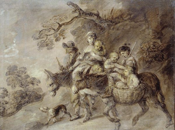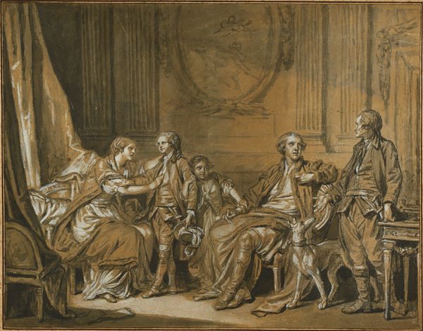Curator: Here we have Robert Smirke's interpretation of a scene from ‘Don Quixote’, titled 'The Afflicted Matron, the Countess Trifaldi', residing here at the Tate. What strikes you first about this composition? Editor: An odd mix of the dramatic and the… well, stagey. Like a play caught mid-act, all gesture and deliberate placement. Curator: Smirke, with his detailed rendering, truly captures the theatricality inherent in Cervantes's narrative. The composition leads the eye across the stage through a subtle interplay of light and shadow. Editor: It feels a little... literal, doesn't it? The figures almost too posed, too consciously arranged. But then again, maybe that's the point. Curator: Perhaps. Smirke invites us to consider not just the story but the artifice of storytelling itself. It’s a painting about performance. Editor: I suppose so. It does spark a sense of that bizarre unreality you only find in stories, but also in a mirror. I quite like it. Curator: Yes, it’s a rich, curious scene indeed.
