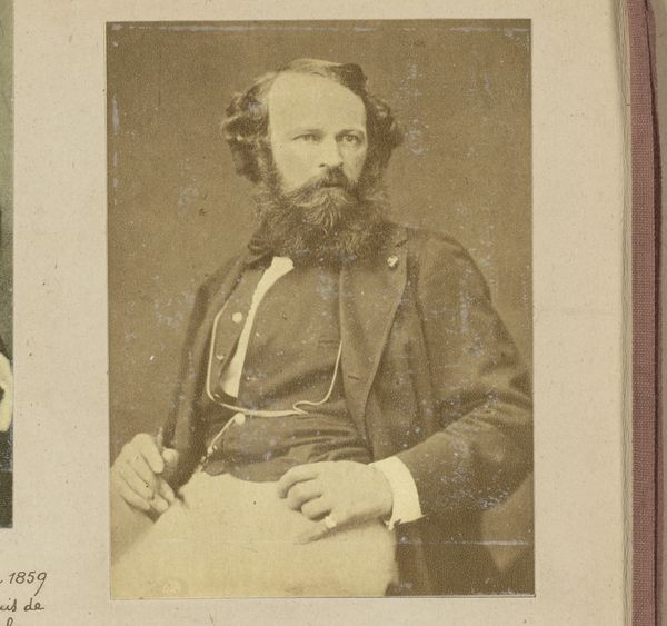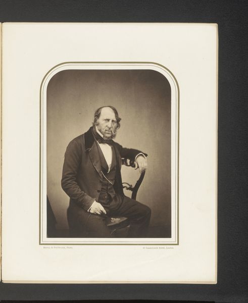Editor: So here we have a photograph, "Portret van een zittende man met ringbaard" made between 1860 and 1900 by George Robert Fitt using the albumen print method. The details are astonishing for this early photographic process, it really jumps off the surface! What draws your attention to this work? Curator: As a materialist, I'm immediately interested in the albumen print itself. We should remember that in the 19th century, photography was rapidly shifting from a luxury good for the elite to a wider, though still controlled, form of image production. Who had access to such methods, and what impact did its process and visibility have on the subject’s social position? Editor: That’s an interesting point about the material's role in reflecting societal structures. What does the choice of material communicate about the sitter and the artist? Curator: The albumen print was popular because it produced sharp, detailed images, which lent an air of scientific accuracy. It allowed for multiple copies, thus, expanding the portrait’s reach and the sitter’s likeness and social capital. Look at the subtle tonalities, the way the light hits the man's beard – all achieved through careful manipulation of the chemistry involved. Editor: Right, it's easy to overlook the labor involved in creating the plate and print! The inscription at the bottom suggests a commercial studio? Curator: Exactly. The address "100 Regent" would likely denote a business location. Fitt was producing these images, not purely for art's sake, but within the constraints and demands of a developing industry and economic marketplace. What narrative does that reveal? Editor: I never thought about how the commercial context and materiality so deeply influences our understanding. Curator: Considering the socio-economic conditions tied to both the production and consumption of images is the most productive thing that we, as historians, can consider in art of any type.