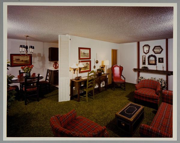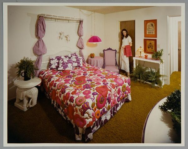 Curator: This is "Watergate" by Victor Burgin, created in 2000. It’s a photograph, seemingly of a nondescript hotel room, yet pregnant with suggestion. Editor: It hits me with this weird sense of melancholy, doesn’t it? That grey light filtering in, that utterly forgettable decor. It's the visual equivalent of elevator music, designed for a kind of… anonymous existing. Curator: Burgin's work often grapples with the hidden layers beneath seemingly ordinary spaces, delving into the socio-political currents that shape our perception of reality. He invites us to see beyond the surface. Editor: Absolutely! It's more than just a snapshot. Notice the painting above the couch – is that supposed to be a grandiose waterfall or something equally... dramatic? It's like a bad imitation of grandeur amidst the utter lack of it in the actual space, or the promise of a "view" obstructed by a grim cloudy sky. Curator: That supposed painting of a "waterfall," or should I say landscape, may as well not exist. It feels as much a cliché as the tired furniture. The "Watergate" title and visual components could point to many narratives surrounding the political scandal, playing on themes of power, surveillance, and hidden agendas. It makes you consider where are we, in relation to the scene. It implicates the viewer in ways both unnerving and enlightening. Editor: Exactly. We’re placed *outside*, looking *in*, observing, but strangely detached. Maybe "Watergate" is also hinting at information being obscured, something bubbling beneath the surface, in the murky water of its history. The ordinary details practically beg for suspicion. Are we peering into a stage set, or a site where deals are cut? Is this space more than just four walls and generic amenities? Curator: I agree completely. There is something unsettling and isolating about this particular space, emphasized by the lack of visible human presence but heavy with suggestions. Editor: Well, thanks to Burgin I’ll probably think twice next time I'm stuck in a bland hotel room staring at a sad view. You know, history and paranoia can make even a mini-bar seem like a geopolitical statement. Curator: It shows the value in re-interpreting these ubiquitous architectural sites and bringing to bear questions of what their actual function really is and whom these spaces intend to target.