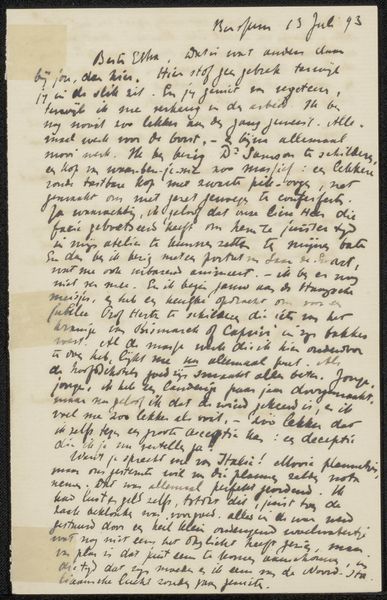 This is a letter by Jan Veth written in 1896 to Etha Fles, and its visual impact arises from the contrast between the formal structure of handwriting and the loose arrangement of text on the page. The dark ink against the pale paper creates a stark contrast, emphasizing the calligraphic quality of the writing, and evoking a sense of intimacy. Veth employs a form of visual rhetoric in his handwriting, carefully structuring each word while also allowing for the natural flow of expression. This interplay between control and spontaneity mirrors the dynamic tension found in language itself, where rules of grammar and syntax coexist with the fluidity of thought and speech. The letter challenges the idea of fixed meaning. Each stroke and flourish contributes to a complex web of associations, reflecting broader cultural and philosophical concerns. The materiality of the letter—the texture of the paper, the quality of the ink— further underscores its status as a unique and personal artifact.