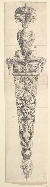 Editor: We're looking at Augustin Hirschvogel's "(Design for a Dagger and Sheath)" from 1543, currently held at The Met. It's a delicate drawing or perhaps an engraving. Honestly, my first thought is…intricate! It's almost overwhelmingly ornate. What leaps out at you? Curator: Overwhelming, yes, in a deliciously Renaissance way. It reminds me of wandering through a cabinet of curiosities. Do you see how the human figure, almost serpentine, forms the hilt? It makes me think about power and danger but also the sheer inventiveness of the Renaissance artist. Imagine holding that! A potent symbol. What do you make of all those grotesque faces incorporated in the design? Editor: I hadn't really focused on the faces individually, but now that you mention it, they definitely add a layer of…unease? It's not just decoration; there's something unsettling about them. Are they meant to be allegorical? Curator: Perhaps! Remember, in the Renaissance, the grotesque wasn't necessarily "ugly." It was more about the strange and the marvelous, blending human, animal, and decorative forms. Hirschvogel may have been playing with ideas of control, of literally grasping the chaotic or monstrous. How does that thought sit with you? Editor: It makes me rethink the piece. It's not just a pretty object. There's a definite tension. Curator: Absolutely! The skill here isn’t just technical, it's conceptual. And do you think Hirschvogel ever imagined that design actually being realized as a dagger? Perhaps he did; it suggests the aspirations of Renaissance artistry – imagination shaping reality. Editor: Thinking about it as something actually made is a completely different perspective. I hadn’t really considered that. Curator: Right? It goes from a curiosity to something tangible, historical. Fascinating.