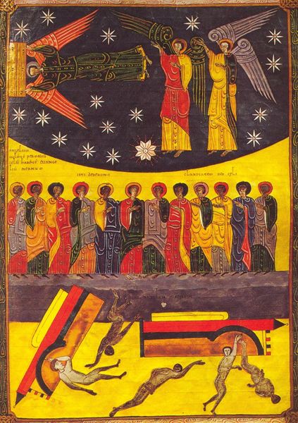 Editor: Here we have a tempera work entitled "Les sept Anges et les sept derniers fléaux. Apoc. XV," attributed to Facundus. The vibrant colors and the stylized figures of angels, juxtaposed against celestial imagery, create a powerful, almost theatrical effect. What strikes you most about it? Curator: I'm immediately drawn to how this image embodies the politics of representation during the Medieval period. We see here a carefully constructed visual narrative of divine power and authority, a visual program serving very specific social and institutional functions. Editor: Can you elaborate on that? Curator: Consider the context: illustrated manuscripts were expensive. Only elite members of society—the church, the monarchy—could afford such elaborate productions. These images then served to reinforce existing hierarchies and communicate religious doctrine to a largely illiterate populace. Do you notice anything about the specific iconography used here? Editor: The seven angels, definitely. Their direct gazes give them a presence that really grabs you. Curator: Precisely. And their robes and positions likely held specific symbolic meanings, easily read by contemporary viewers. We see medieval culture working actively through symbolism in an immediately apprehendable way. This manuscript functioned within a carefully regulated visual economy designed to reinforce faith and legitimize power structures. Editor: So, the image wasn't just aesthetically pleasing, but a tool for social control, in a way? Curator: Absolutely. Understanding that makes us better equipped to reflect critically on the role images continue to play in shaping our own perceptions and power structures today. Editor: I see what you mean. It’s amazing how much history can be packed into what initially looks like just a pretty picture! Thanks for helping me dig a little deeper into that, it changed how I think of art like this.