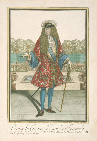 Curator: This is Josef Kriehuber’s "Leopold I," a painting created in 1828. It depicts Leopold I of Hungary. Editor: My first thought is how carefully balanced the elements are. The gold embellishments provide such a striking visual rhythm against the deep blues and blacks. And the softness of the pink drapery creates a wonderful contrast against Leopold’s stiff formality. Curator: Indeed. This piece emerges from the Romanticism movement. Look closely at how Leopold, known for consolidating Habsburg rule amidst various wars and internal conflicts, is portrayed. There's an intentional emphasis on the symbolism of power, but I also note a tension between representation and lived realities given that this was produced long after his actual reign. Editor: You see the symbols; I see the structure. The meticulous arrangement of colors leads your eye from his face, down the intricate patterns of his clothing, and eventually settles on the crown. Curator: That crown is strategically placed. Consider the historical context: Leopold's reign, marked by the expansion of Habsburg influence and resistance to Ottoman aggression, shaped Central Europe. How does this formal portrait contribute to the narrative of imperial dominance and the subjugation of diverse populations within the Austro-Hungarian empire? Editor: Perhaps that is something this painter may not have necessarily intended or considered. It’s equally fascinating to explore how the print medium influences our reading. Note the flattening of space and emphasis on line over tonal variation. Does this shift in medium alter its perceived aura of authority? Curator: It certainly allows for broader dissemination of a carefully curated image. And this is exactly what makes unpacking such portrayals crucial: How did these representations shape public perception and legitimize power structures? Editor: Exactly. For me, this work offers so many details that capture the imagination, like the precise balance of colour and tone. Curator: And I am compelled to explore the deeper implications and resonances it has within the landscape of societal power and the legacies of historical injustices.