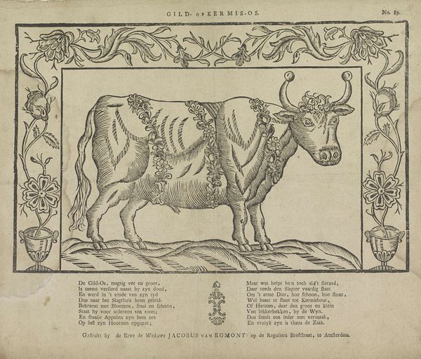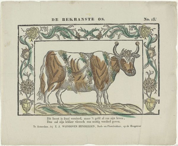 Editor: This print, titled "De bekranste os," or "The Garlanded Ox," created sometime between 1832 and 1850, uses engraving. It looks like the ox is decorated for… something? What do you see in this piece? Curator: Well, what I see is a pointed commentary on the objectification of animals for consumption, typical for prints of that era. Editor: Objectification? It just looks like…decoration. Curator: It's more insidious. Think about the floral garlands. On the one hand, there's beauty. But aren’t these garlands ultimately masking the grim reality of the animal's fate, softening the reality that the poem references as a source of human nourishment? This reminds me of current debates around how food industries use visual imagery. The text also gives important context about the role that this animal had within the local economy. This print isn't simply decorative, it's socially and politically charged. Editor: I didn’t think about the link to the current meat industry! Curator: It's about connecting those historical threads to current realities. Looking at these materials – drawing and engraving – forces us to confront ethical considerations within visual representation and material consumption then, as it is now. This era laid some groundwork for us, in some way! Editor: I guess I see the print with fresh eyes now. Curator: Exactly. The piece challenges our own participation in those systems. Now, let’s talk about Erve Wijsmuller and his shop in Amsterdam. He produced and sold numerous satirical and politically-motivated prints just like this.