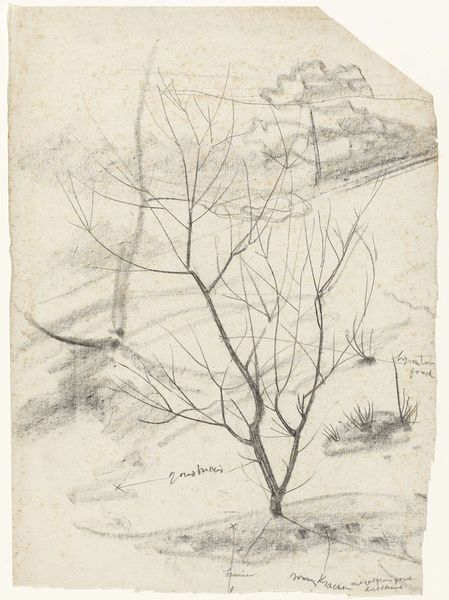 Curator: Looking at Richard Nicolaüs Roland Holst's "Boomgaard te Eemnes," made sometime between 1878 and 1938, the overwhelming impression is one of serene observation, wouldn't you agree? Editor: Serene perhaps, but my immediate response is more melancholic. The muted tones and delicate lines evoke a sense of fragility and impermanence, like a memory fading at the edges. It's rendered in pen and etching, correct? Curator: It is, which deepens the narrative. Consider that the etching itself embodies layers of process. Roland Holst engages themes around rural life, alienation from the self, class struggle, love, identity, the construction of narratives. A range of historical processes is folded into the work, if you will. It resonates as deeply psychological; are those the fences that keep the working class, and maybe even all of us, separated and limited in what can be achieved? The chickens seem so vulnerable in that wide open space. Editor: The composition definitely speaks to a certain isolation. The starkness of the tree trunk and its placement create a visual pause. It's a structural pillar amid all the sprawling chaos, both containing and confined by the etching’s meticulous web of lines and varying tone and densities. I do feel though the formal relationships have their own sort of balance. Curator: But to whose advantage, I wonder? Are these rural Dutch subjects empowered by it, or complicit in their own silencing? Where do race and class fit in this landscape? How do these factors determine relationships within rural, and greater Dutch, society? Even nature cannot escape historical encoding in its representational form; landscape isn’t simply neutral ground. Editor: Your reading certainly offers a wider lens onto social imbalances, and perhaps it underscores the limitations of a purely formalist reading. Curator: Every element in art has political weight, regardless of artistic intent; but also beauty! Editor: Well said. Seeing it framed this way helps me appreciate the multi-dimensionality; not just the forms, but also the underlying discourses and historical weight this piece truly carries. Thank you.