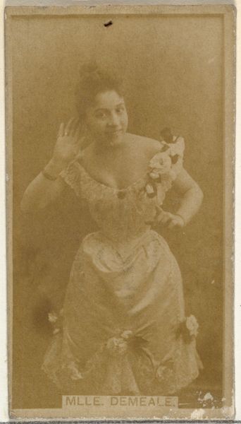 Curator: I find myself quite drawn to the dreamy, almost faded quality of this photograph. There's a story whispered within its sepia tones, a sense of forgotten glamour. Editor: It definitely speaks to a particular kind of cultural moment. What we're looking at is an albumen print, part of the "Actors and Actresses" series by W. Duke, Sons & Co., dating from between 1890 and 1895. They were included in cigarette packs as a promotional item. Think of it as an early form of trading card meets advertisement. Curator: So, the price of beauty, in a way, was consumption itself. This delicate, thoughtful portrait essentially became disposable. It tugs at something within, a lament for the ephemeral nature of fame and the often-invisible labor behind even the simplest image. Editor: Exactly! Consider the material process. Albumen prints used egg whites to bind the photographic chemicals to the paper. It’s a labor-intensive process that required specific skills. And this particular card promotes Duke Cigarettes – we’re seeing the intertwining of the burgeoning entertainment industry with mass production and, of course, the addictive tobacco trade. It is about more than aesthetics. Curator: The subject, an unnamed actress wearing what looks like a quite dazzling bodice, gaze turned slightly upward… What was she dreaming of, I wonder? I want to feel, just for a second, the fleeting ambition, vulnerability, and sheer guts it took to put oneself on display, especially with that backdrop of material circumstances bearing down, even back then. Editor: I notice her patterned bodice, its details, perhaps mimicking "exotic" or Orientalist motifs popular in the theater. These cards constructed not only celebrity but also consumer desire around fantasies sold by mass media. The materials, the techniques, even her costume choice all speak to this cultural web. Curator: It all connects – a beautiful face, caught forever on a small card, that made the manufacturer profit. Thinking about the whole scope of it – who is this woman? What sacrifices were made for beauty and fame? Editor: Indeed. Looking closely connects you back through time and process. From production lines, to labor, all the way to the hand slipping this card into a cigarette pack and another setting trends. You could reflect for ages... Curator: Ultimately, perhaps, this small print whispers of all the vanished stories and faces who once dreamed. The very notion makes me quiet now.