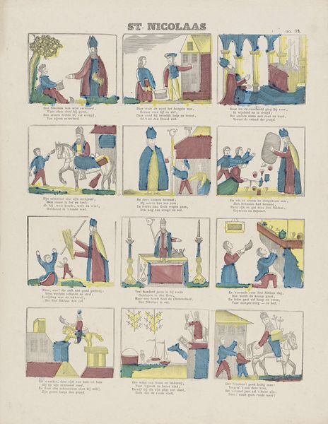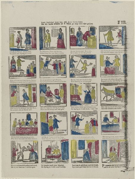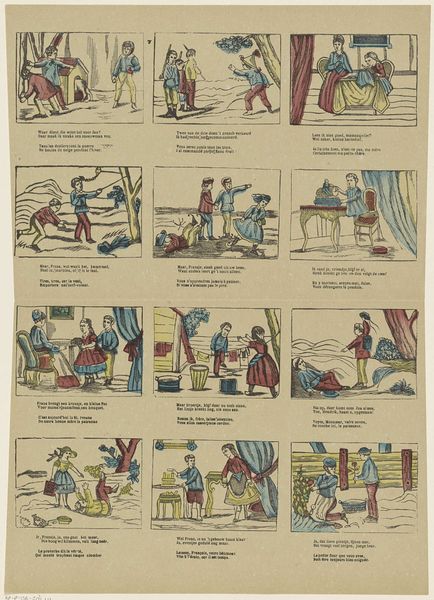 Editor: So, we’re looking at “Vrouwelijke bezigheden,” or "Female Activities," a print made sometime between 1848 and 1881, by Lutkie & Cranenburg, here at the Rijksmuseum. It strikes me as both quaint and incredibly regimented; a series of vignettes depicting women doing chores. What can you tell us about the context for a work like this? Curator: Well, first, let’s consider the socio-political backdrop. Mid-19th century Netherlands was deeply patriarchal, with clearly defined gender roles. This print isn't just showing women doing chores, it's actively reinforcing the ideal of domesticity. Who do you think was the intended audience for this work? Editor: Probably middle-class families? Maybe to hang in their homes to remind everyone, especially the women, of their duties? Curator: Precisely! And the stylistic choices – the simple linework, the somewhat folksy aesthetic – all point towards accessibility and widespread distribution. These weren't meant for the wealthy elite. Think about how the industrial revolution might affect these depictions. Editor: Hmm, mass production? Could the print be tapping into anxieties around those new mechanized modes of production, by emphasizing the comforting image of traditional female labour? Curator: That's a great insight. Also notice how it glosses over the harder realities of housework; it's a sanitized version. Does that affect your reading? Editor: Absolutely, it definitely reveals a specific ideology. It reminds me how crucial it is to critically examine what images choose to depict – and, crucially, what they leave out! Curator: Indeed. Seeing it as a carefully constructed piece of social messaging rather than a simple depiction of everyday life certainly changes our understanding of its historical function, right? Editor: Yes, I'll definitely think twice now about so-called 'snapshots' of daily life!