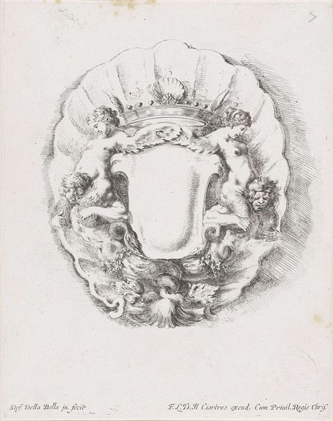 Curator: Oh, my! This just tickles me. It’s like a sweet little secret whispered from another time, all delicate lines and playful cherubs. Editor: We're looking at "Three Putti around a Medallion," a work attributed to Simon Fokke, likely created sometime between 1722 and 1784. Currently, this drawing resides here in the Rijksmuseum. I am immediately drawn to the circular framing device, how it concentrates the gaze. Curator: A circle indeed – a porthole into something delightful! I see them there, the cherubs... such mischievous glee in their eyes. Like they’re about to drop a water balloon on someone important. Editor: The putti introduce an element of classical allegory; a sort of ornamentation popular during that era. I notice, too, the contrast between the sketch-like quality and the precision with which details are rendered; note the textures of the foliage versus the smooth skin of the cherubs. Curator: I feel the paper practically humming with Fokke's quick hand – he captures this fluttery sense of movement. The light, feathery strokes—I can almost smell the ink and paper! Editor: This sense of "movement" is largely created by the layering of shading, lending a depth that transcends simple line work. Also note how the emptiness inside the medallion invites projection; what significance do we find in this vacant space? Curator: Ooh, now there's a question. A blank canvas for the dreams of little angels perhaps? A mirror reflecting only pure possibility? Or maybe, just maybe, it was intended for a portrait but Fokke simply got distracted by all those delicious cherubs. Editor: Perhaps it is a conscious choice, allowing the viewer to engage in a form of visual completion. This resonates, interestingly, with minimalist approaches to spatial and symbolic articulation that recur in artistic expression throughout history. Curator: Right, and it really feels complete. The composition carries this beautiful completeness...like catching a soap bubble before it bursts, containing the colors in thin film of hope! Well, I have to admit, I'm rather taken by those cherubs and all the hidden stories nestled in those lines! Editor: Indeed, its artistic achievement lies precisely in that equilibrium between technical mastery and poetic license. An engaging conversation, certainly, about historical representation!