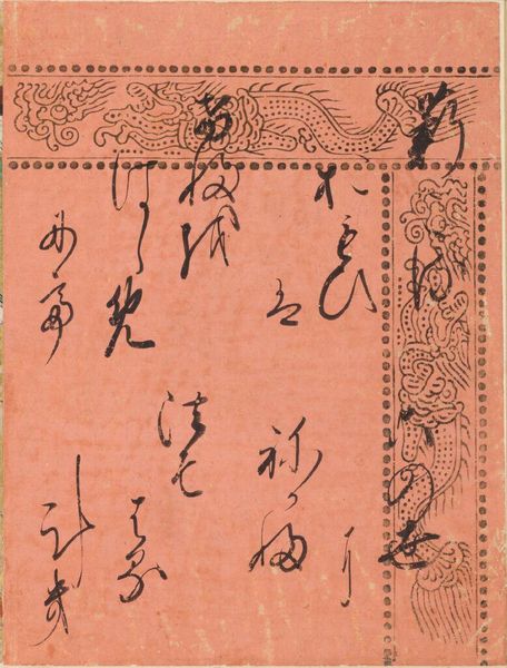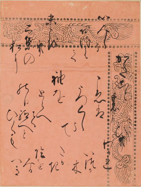 Curator: The Cressets, or Kagaribi, is a calligraphic excerpt from Chapter 27 of the Tale of Genji, rendered by SanjÅnishi Sanetaka. It's just over 9 inches tall and sits on a pale blue ground. Editor: The script has a wonderful gestural quality, and the color seems to evoke a kind of quiet melancholy. Curator: Indeed. The Tale of Genji is central to Japanese literary and cultural identity, exploring themes of love, loss, and the fleeting nature of beauty, deeply influencing Japanese aesthetics. Editor: Notice how the composition balances the dense calligraphic forms with the negative space, creating visual rhythm. Also, the borders seem to be almost like a cloud motif, framing the words. Curator: The cloud motif is very interesting, particularly when considering the content of the Tale itself and the symbol of illumination that Cressets offer, guiding through the darkness. Editor: The overall effect is remarkably intimate, bridging centuries with a few brushstrokes. Curator: It’s a potent reminder of art’s capacity to convey complex narratives and resonate across time.