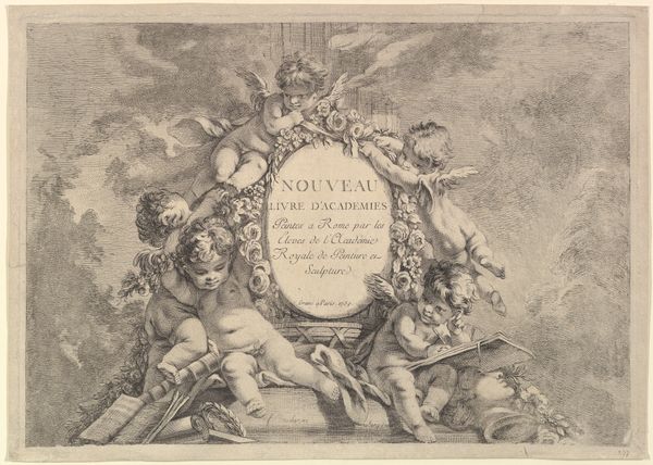 Editor: This is “Pan picking grapes while Syrinx grabs his shoulder, with three leopards and two putti below them” created in 1787 by Charles Nicolas Varin. It's an engraving and quite busy, isn't it? All those figures, the landscape... What strikes me is how this rather frivolous scene, seemingly about pleasure, also feels very staged and artificial. How do you interpret this work? Curator: Well, that artificiality you’re sensing is telling. Think about who would have commissioned this image. The inscription at the bottom clearly says it was intended “For the Gallery of S.A.S. Monseigneur Le Duc d'Orleans.” Prints like these functioned as ways for the Duke of Orleans to circulate images of his collection widely. So, what seems frivolous is in fact a carefully crafted projection of aristocratic taste and the prestige associated with art collecting. Editor: So it's less about the actual narrative of Pan and Syrinx, and more about projecting a certain image? Curator: Exactly. Consider the idealized figures, the reference to classical mythology, the implied abundance and the presence of exotic animals, such as leopards, which indicates worldliness. Everything is meticulously chosen to convey the Duke’s refinement and power. This print isn’t simply a reproduction, it's a promotional tool operating within specific social and institutional networks. What's fascinating to consider is what art objects people chose to circulate images of in the pre-digital age, and to what effect. Editor: I see now. It makes me reconsider the power dynamics involved in art, not just in its creation but in its reproduction and dissemination. Curator: Precisely. It makes you wonder about who art is *really* for. Editor: It’s not always about what’s on the surface but about the systems at play, isn't it? That’s such an interesting way to frame this work. Curator: It's a good reminder that art always exists within broader historical and social structures.