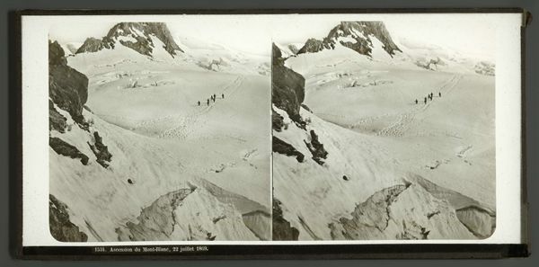 Editor: This photograph, "Summit of Mont Titlis, Switzerland," was captured in 1866 by Adolphe Braun using the gelatin silver print method. There’s something so stark about the vast, snowy landscape. What significance do you see in representing such remote places? Curator: Think of the mountain itself. Its summit, forever capped with white, acts as a timeless symbol, perhaps of purity, but also of challenge. How might the act of scaling a summit tie into our psychological drive for transcendence or spiritual enlightenment? The figures here almost serve as archetypes – humankind dwarfed, yet also driven by the landscape’s implicit power. Editor: That’s a great point about the figures. They almost seem insignificant against the enormity of the mountain range. Curator: Exactly! But it's more complex. Consider the deliberate act of naming: Titlis. What feelings might that invoke? Are there pre-Christian associations to be aware of, or is it meant to be understood through the lens of emerging nationalist pride of the 19th Century? Consider how that relates to our relationship with nature. Editor: So, even without overt religious symbols, you see this landscape as speaking to larger ideas about human existence and cultural identity? Curator: Precisely. Early photography allowed more people to access scenes of grandeur previously only known through written accounts or artistic depictions. The symbolic weight then shifts, becoming democratized. What power does this 'real' image then wield for its contemporary viewer? What expectations of the sublime are being activated and what belief systems might be evolving because of these new modes of seeing? Editor: That makes so much sense. I never considered how the rise of photography changed what a landscape could even *mean*. Curator: It opens new pathways for understanding, doesn’t it? We start seeing echoes and foreshadowing of what will become commonplace in art of the next century. Editor: This has given me so much to consider about the relationship between photography and cultural understanding! Thank you!