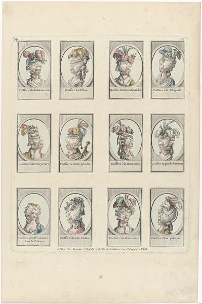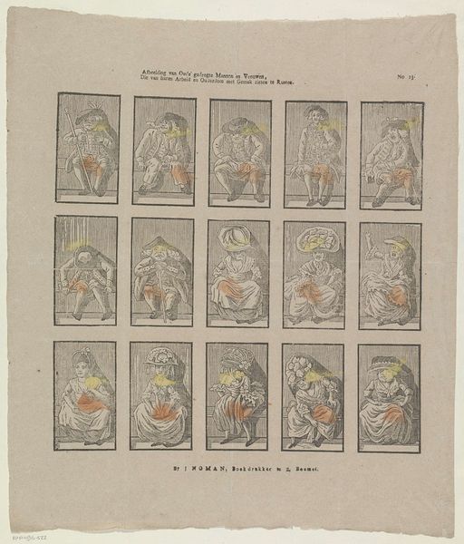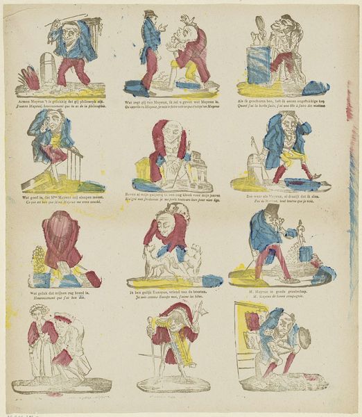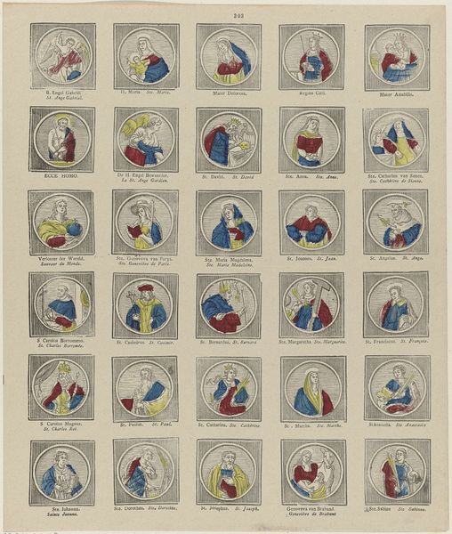 Philippus Jacobus Brepols created this print, "Evangelisten en apostelen", using lithography. The composition presents a grid of oval portraits, each depicting a saint. The limited color palette—primarily red, yellow, and blue—creates a striking visual rhythm across the sheet, and the arrangement emphasizes a structured, almost taxonomic presentation of religious figures. This work's power resides in its interplay of form and content, as the composition is structured to suggest a systematized depiction of faith. The simple, almost abstract rendering of each figure prompts a focus on the structural elements of color and shape, rather than narrative detail. The reduction of each apostle and evangelist to basic chromatic components challenges conventional religious iconography. In this way, Brepols invites a semiotic reading, where color and composition become signs, destabilizing established meanings and prompting new ways of engaging with religious representation.