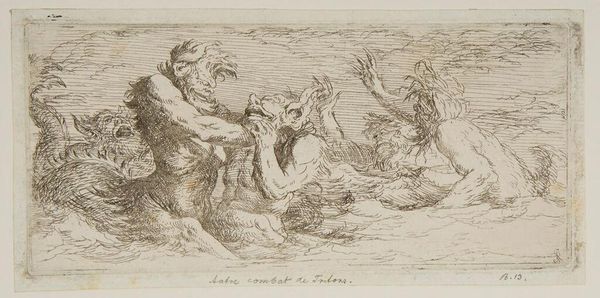 Curator: This is Christian Wilhelm Ernst Dietrich's "Battle of Tritons." It's a captivating drawing with a clear date of 1763. Editor: The composition immediately strikes me. The chaotic lines create a sense of dynamic energy, even violence, in the scene. Curator: Indeed. Dietrich was a master of etching, and you can see how he uses line to create depth and movement. The subject itself, tritons in combat, speaks to the enduring fascination with classical mythology. Editor: Absolutely, and the way the tritons grapple over what appears to be a boulder, their muscular forms twisting, it's all rendered with such expressive freedom. Curator: These mythological subjects were often used to explore themes of power, conflict, and the relationship between humans and the natural world. Dietrich's work reflects the influence of the Baroque era. Editor: It's a whirlwind of line and form, a dramatic vision of the sea's raw power. Curator: A testament to the enduring appeal of classical themes and a masterclass in etching. Editor: It really does invite us to contemplate our own relationship to conflict and the untamed forces of nature.