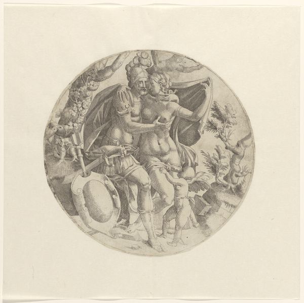 Curator: Standing before us is a drawing attributed to an anonymous artist of the Renaissance, sometime between 1550 and 1600, entitled "The Head of Pompey Presented to Caesar." Editor: My first thought is how much the gray pencil evokes a kind of ancient statuary—a bas relief. The figures are caught in an interesting composition: a circle framed within a square. Curator: It depicts a pivotal moment in Roman history: the aftermath of Pompey’s assassination and the presentation of his severed head to Julius Caesar. It’s held at the Metropolitan Museum of Art here in New York City. Editor: Caesar's body language interests me here. Look at the passivity: leaning back, arm outstretched to receive the gruesome object. It’s all line and form creating that interesting stillness in the roundel format. Curator: Exactly, Caesar's gesture, while receiving such a potent symbol of victory and demise, underscores the complexities of power. The drawing prompts reflection on the role of imagery in shaping political narratives and the artist’s own perspective within that tumultuous era. The artist perhaps sought to comment on the dangers of unchecked ambition. Editor: I'm interested in that narrative being constructed by a stark minimalism. I almost don't want to think about it beyond the geometry—the thrust of those diagonal lines of the banners against the passivity of Caesar's repose. Does the social context enhance or detract from the artistic achievement, or vice versa? I’m torn. Curator: It is difficult to separate the image from its powerful historical implications, its very role in crafting Caesar’s political position. Editor: Perhaps. I am drawn more to the timeless qualities of form and their evocative abilities independent of that original social intent. Curator: Interesting perspectives, as always! This anonymous print certainly holds a fascinating, complex place in our collection, a window into both the Renaissance and the enduring power struggles of ancient Rome. Editor: Indeed—a conversation in shapes that will long continue!