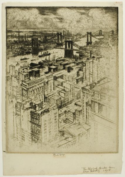 Curator: Donald Shaw MacLaughlan, born in 1876, created this print titled "Sky-line, Chicago," now residing at the Harvard Art Museums. Editor: It's striking, isn't it? The concentration of vertical lines—it evokes a sense of burgeoning industrial power. Curator: Indeed. Note the skillful use of hatching and cross-hatching to define form and create depth within the architectural masses. MacLaughlan coaxes a range of tonal values from the etched line. Editor: And what about the implications of this urban landscape? We must acknowledge the labor and the socio-economic disparities inherent in such a built environment. Curator: Perhaps, but the formal arrangement is what truly commands attention here. The carefully balanced composition creates a harmonious tension between the individual structures and the unified skyline. Editor: Ultimately, the image provokes questions regarding progress and its consequences—a reflection of early 20th-century urban anxieties. Curator: An astute observation; however, the pure aesthetic experience derived from the artist's mastery of technique cannot be overlooked.