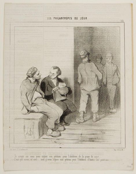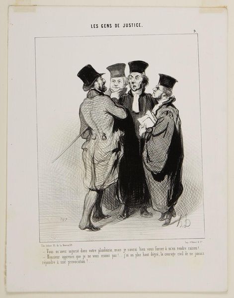 Editor: This lithograph, "You gentlemen doubtless have some game to declare?" by Honoré Daumier, feels like a jab at… well, someone. The faces are so expressive! What's your take on this scene? Curator: Ah, Daumier! He's like a visual comedian with a sharp wit. Notice how the tax collector, so to speak, seems to be questioning these hapless hunters. The whole scene is a beautiful commentary on the absurdity of hunting, isn't it? Editor: Absolutely! And the detail in the faces really drives that home. Curator: Daumier’s gift was that he could see the irony in everyday life. It makes you think, what are we *really* chasing? Is it just... aches and pains? Editor: I hadn't thought about it like that, thanks! Curator: My pleasure.