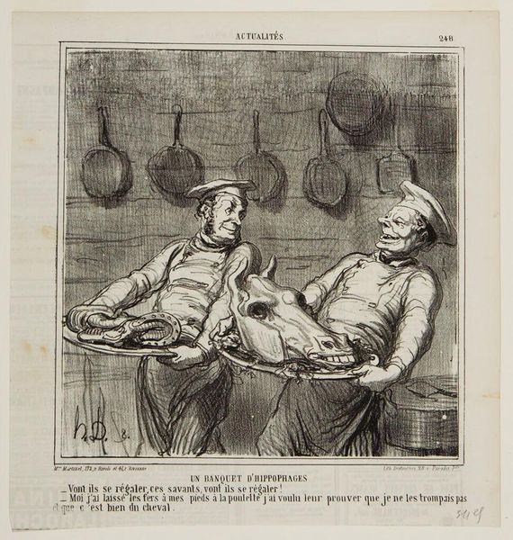 Editor: This is Honoré Daumier's "Sir, I drink to you!", a black and white lithograph. The figures are so distorted! What do you see in the composition that gives it this grotesque quality? Curator: Notice how Daumier employs exaggerated lines and caricature. The distortion serves to highlight the social satire inherent in the work. See the stark contrast and angular forms? Editor: Yes, the shadows and lines are quite harsh. It seems deliberate. Is the visual tension part of the meaning? Curator: Precisely. The distorted forms, coupled with the stark contrast, amplify the overall message about societal hypocrisy and decadence. It's all embedded in the line work. Editor: I see it now. It is like the form *is* the content. Curator: Indeed. Daumier uses form to convey the social message.