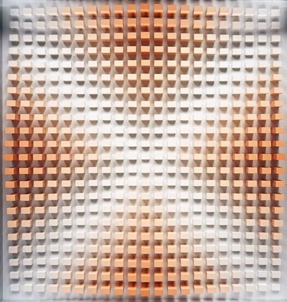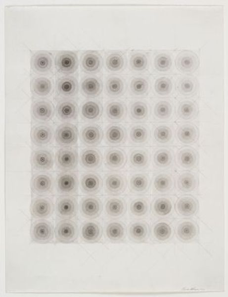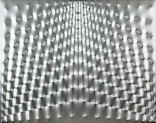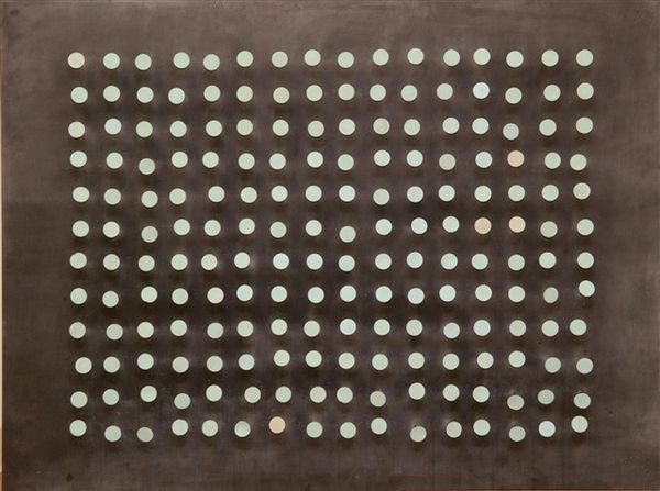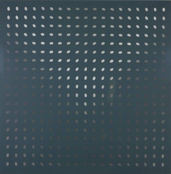Curator: Oh, wow. It’s like staring into a receding horizon of light. Kinda meditative, right? Almost hypnotic. Editor: Precisely the reaction Castellani was aiming for, I suspect. This is his "Superficie alluminio" from 1969, a defining example of his exploration into shaping surfaces as a means of artistic expression. It’s aluminum, cool to the touch I imagine, but creating an illusion of infinite depth. Curator: It’s funny, because the material itself seems so...cold. Industrial. But the overall effect is surprisingly organic. Almost like…the scales of a dragon, glinting in the sun. Editor: A keen observation. Castellani's work stands as a critique of traditional painting. By manipulating the canvas – in this case, aluminum – he challenges the idea of the canvas as merely a surface for representation. He perforates and reforms the material, compelling it to be the subject itself. In doing so, he aligns himself with post-war movements aiming to break down the boundaries between different art forms. Curator: So, he’s kind of freeing the canvas, letting it speak for itself, scream even! You know, breaking free of the rectangular confines by pushing those little protrusions outward? It's like he’s saying, "I refuse to just passively accept this square.” Editor: In a way, yes. This period, especially after World War II, witnessed artists questioning societal structures. Art became a stage for demonstrating dissent, critiquing established systems. Castellani uses the very physical act of manipulating materials as a parallel to social reconstruction. His art thus engages directly in the critical conversation of his time. Curator: Huh. I always thought of minimal art as detached. Like it lived in a vacuum, divorced from reality. But the socio-political ties add so many layers, making this much richer than just pretty metal dots. Editor: Indeed, understanding art within its historical and cultural framework allows us to discover the intricate dialogues and dynamic tensions that inform artistic expression. By connecting the artwork to its specific contexts we augment its aesthetic dimensions and provide an analysis which includes the public sphere of art, culture and political image. Curator: Okay. I will now look at minimal art with a different light, understanding that sometimes simplicity hides rebellious complexity. Editor: And hopefully now more folks will share that broader view.