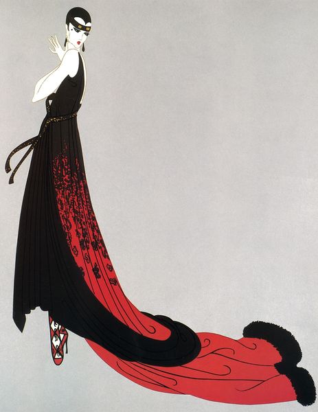 Editor: This is a mixed media drawing entitled "Yvette," created by Erte, though the exact date isn't specified. It’s a portrait, seemingly a fashion design, featuring a woman in an elaborate black and pink dress. It strikes me as incredibly glamorous and stylized, very much embodying the Art Deco aesthetic. How do you interpret this work? Curator: Erte’s "Yvette" encapsulates the complex position of women during the interwar period. This isn't merely a glamorous image; it's a visual negotiation of identity. The Art Deco style, with its emphasis on sleek lines and opulent materials, reflects a desire for modernity and liberation from Victorian constraints, yet it often reinforces traditional beauty standards. Editor: That’s interesting, I hadn’t considered the tension between liberation and traditional beauty. Curator: Consider the historical context: The 1920s witnessed increased female participation in the workforce and significant social changes. Yet, idealized images in fashion and media still largely dictated how women were perceived and how they perceived themselves. This drawing captures that tension, doesn't it? What message is communicated by her outfit and expression? Editor: It looks to me like a controlled elegance – the sharp lines, the precise makeup, the ornate lace detail. It hints at freedom but also a confinement, a performance maybe. Curator: Precisely! Erte presents us with a figure embodying a carefully constructed femininity. The drawing prompts questions about performance, agency, and the constraints of representation during a pivotal moment in women’s history. The visual codes speak to both empowerment and the pressures of societal expectations. Editor: So, it’s less about simple beauty and more about the cultural moment in which that beauty was defined? Curator: Exactly! Erte's work becomes a lens through which we can examine the historical and social forces shaping identity, and that still feels relevant today. Editor: I see that now! It is much more than a fashion sketch. Thanks for providing that insight.