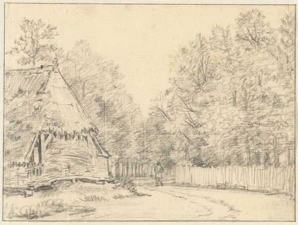 Curator: This is "Village Street, with Logs in the Foreground," an etching by Joannes van Doetecum. Notice how the composition is structured around the receding road and the placement of the buildings. Editor: It's stark, almost bleak. The emphasis on raw materials like the logs makes me think of the labor and resources needed for building and sustaining a community. Curator: Observe how the artist employs linear perspective to create depth, leading the eye into the village itself. The contrast between the dark lines and light spaces defines form and texture. Editor: The roughness of the etching mirrors the roughness of rural life. The texture feels deliberate, highlighting the physicality of both the artwork and the depicted scene. Curator: Indeed, the etching technique, with its emphasis on line and form, creates a complex visual interplay between the foreground logs and the distant structures. Editor: It speaks volumes about the relationship between humans and their immediate environment—a dialogue of necessity and resourcefulness. A poignant, quiet piece.