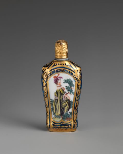 This delicate scent bottle, crafted by Ginsburg, presents a serene scene of a woman seated in a garden, adorned with lush trees and an elegant fountain. The garden, a recurring symbol across cultures, represents paradise, a space of pleasure and contemplation. Our minds are transported to the Garden of Eden, a space of innocence and temptation. Note how the fountain's cascading water suggests purity and life, echoing the classical nymphs found in Renaissance paintings. The woman's tranquil pose evokes the Venus Pudica, a symbol of modesty and beauty, yet her exposed shoulders hint at sensuality. This duality reminds us of Botticelli's Venus, who emerges from the sea, embodying both sacred and profane love. The cyclical nature of these symbols is evident. They resurface, evolve, and are continually imbued with new meanings, connecting us to the collective memory of humanity. The garden, the fountain, and the idealized female form—each carries an emotional and psychological charge, engaging viewers on a deep, subconscious level.