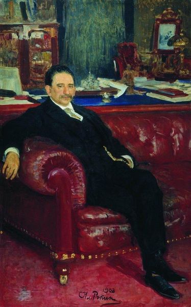Editor: So, this is Ilya Repin’s "Portrait of J.M. Vengerov," painted in 1915, using oil. The sitter seems very self-assured. What can you tell me about it? Curator: Repin masterfully captures a sense of intellectual authority here. The way Vengerov holds his face, the slight smile, it all points to a deep well of knowledge and perhaps a hint of amusement. Consider the color palette. Red, white, and black symbolize power, clarity, and structure. Do you think this was a conscious choice? Editor: It might be. It’s a very striking combination of colors that feels very deliberate and even a little bit serious, while he's got this playful expression! The background colors, do those clash intentionally? Curator: Indeed. And that playful look in his eyes speaks to a layered personality. Notice the positioning of his hand against his face. In iconic terms, it might suggest contemplation, even a moment of creative or intellectual epiphany. Repin might be making a visual statement. How does this pose speak to you? Editor: I hadn’t thought of it that way, but that makes sense! It elevates him beyond just a face in a painting and shows an active, engaged mind, which feels very important. This seems like a portrait meant to signal the sitter’s internal life. Curator: Precisely. Portraits from this period aimed not just to represent the physical appearance but also the essence and social standing of the sitter. In 1915, the winds of revolution were about to sweep across Russia; representing the intellectual class in such a knowing light says much about how society perceived and valued intellectuals at the time, doesn’t it? Editor: Absolutely. Thinking about that historical context, that small detail about intellectual elites during revolution makes this portrait even richer. I didn't notice that at first glance, but now it gives it a completely different depth! Curator: These painted symbols grant an invitation to consider what continuities remain with us even today!