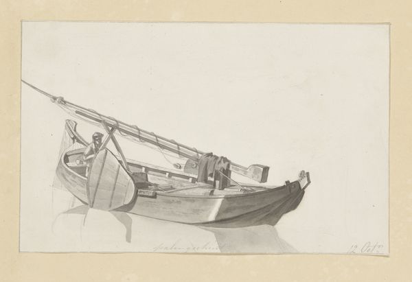 Editor: This pencil drawing is titled "Ein Boot auf dem Strande liegend, in der Ferne drei Figuren" and is attributed to Fritz Bamberger. It looks like a study of a boat resting on a shore. I find the subdued color palette creates a very calm and still atmosphere. What strikes you most about this work? Curator: The stark horizontality defined by the boat's resting place on the sand, coupled with the subdued tonal range of the pencil, establishes a study in stillness. Observe the contrasting textures—the rough grains of the beach against the smooth hull of the boat, partially obscured by what appears to be a loosely draped canvas. The artist's precise draftsmanship delineates the boat's form, imbuing it with a sense of tangible presence. Do you notice how the three distant figures contribute to the spatial recession? Editor: Yes, they're quite small and further up the shore. The composition seems carefully planned, directing my gaze from the foreground boat to the distant figures. Why do you think the artist chose such a restrained approach in terms of color and detail? Curator: Perhaps Bamberger sought to convey a specific mood, emphasizing form and texture over chromatic brilliance. Consider how the restricted palette enhances the clarity of the boat's structure and allows the interplay of light and shadow to take precedence. Is it possible this a mere study in line, form, and the organization of pictorial space? Editor: That's a compelling perspective. I was so focused on what was depicted, I missed appreciating it simply for its compositional qualities. The framing and tonal control create a strong sense of depth. Curator: Precisely. By attending to the intrinsic elements, we can glean insights that a purely representational reading might obscure. Editor: Thank you. Now I better understand that the art isn't just the drawing of a boat on the shore, but the experience of carefully looking. Curator: Indeed. Focusing on intrinsic artistic values allows us to deeply engage with and understand the object on its own merits.