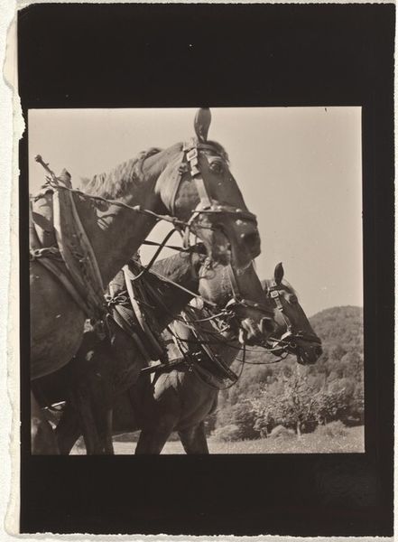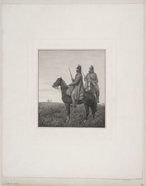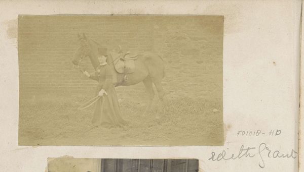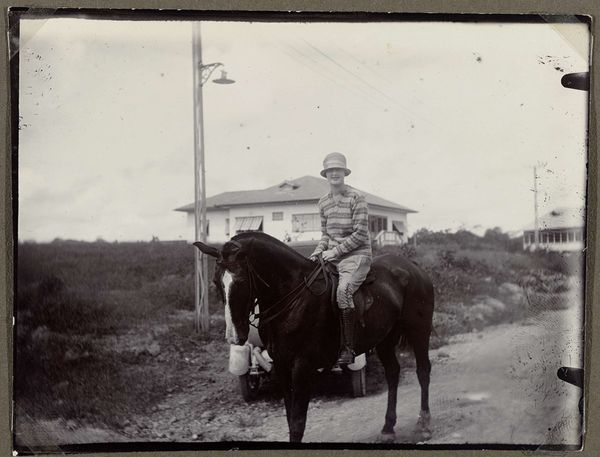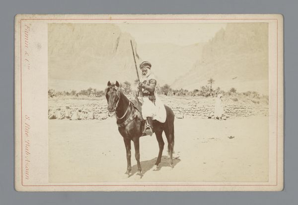 William Henry Jackson made this photograph, "Cowboy te paard," using an albumen print, an early photographic process lending the image its sepia tones and subtle gradations. The composition centers on the figure of a cowboy, firmly seated on his horse against a vast, open landscape, establishing a stark contrast between the detailed foreground and the blurred horizon. Jackson employs the formal qualities of light and shadow to articulate depth and texture. Note how the light catches the cowboy's hat and clothing, emphasizing his presence in the scene. Simultaneously, the structural arrangement invites a semiotic reading of the American West, challenging conventional narratives. The cowboy is not presented heroically, but as an ordinary figure, his form melding with the subdued landscape. Consider how Jackson, through his formal choices, prompts us to reconsider the relationship between individual, environment, and representation. What might it suggest about man's place within a natural setting?