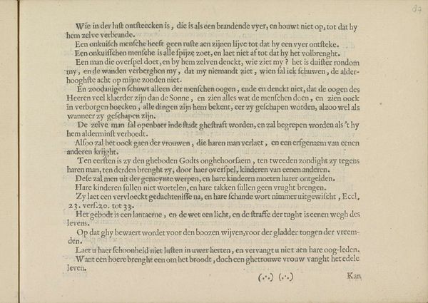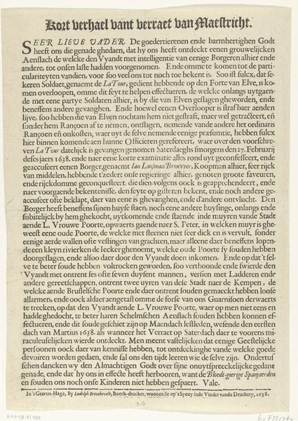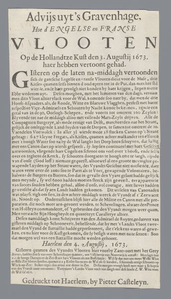 Curator: Here we have a broadside—essentially a printed announcement—from 1673, titled "Uitschrijving door de Staten-Generaal van een dankdag voor de overwinningen in de zeeslagen van juni 1673." The States-General, the governing body of the Dutch Republic, ordered a day of thanksgiving for naval victories against the English and French. Editor: It looks incredibly…stark. Dense blocks of text fill the page. I feel a weight of formality, a pronouncement from on high. All I can do is see that text. It feels impenetrable, even with a translation. Curator: The typography and layout are characteristic of the Dutch Golden Age, prioritizing conveying information directly, as the ruling class exercises authority. As a textile, it's fragile now, yet it was once plastered all over town—in effect a social media post of the time. The language, with its long sentences and religious references, really emphasizes divine providence as the key to Dutch military success. Editor: What resonates with me is the deliberate construction of national identity at a critical historical point. A "day of thanksgiving" becomes a political performance, solidifying Dutch identity against its enemies, and legitimizing state power in a moment of crisis. The text specifically outlines not just prayers of thanks but behavioral dictates; shutting down businesses to concentrate hearts and minds on God. Curator: Exactly! Notice the subtle power dynamics at play. They invoke God's protection but also reinforce social order. Activities like "Tappen, Kactíen, Bal-slaen" were forbidden on this holy day, suppressing entertainment to unify people and show their support to the religious movement, not as forced conversion, but social stability. Even the closing wishes carry cultural weight. Editor: But who is it really "unifying?" It's easy to romanticize a moment of collective identity. For those outside the dominant Protestant group, this celebration was an exercise in exclusion, another demand for conformity. That line at the end speaks volumes—who does it threaten? The emphasis on the "true Christian reformed religion" underlines the era's exclusionary politics. Curator: I suppose by calling attention to it, we re-inscribe its social memory, or at least the possibility for one, as its visual rhetoric reflects the priorities of the time: power, control, but also cultural pride. Editor: Yes. Now more than ever, as an image, the announcement offers critical insight to that crucial struggle to find collective understanding and its ongoing redefinition over centuries of shared, though often unshared, historical trauma.