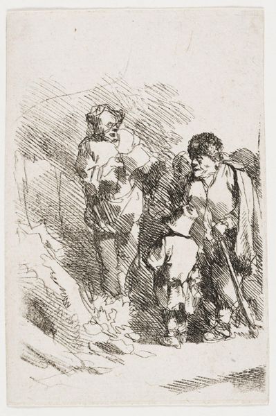 Curator: Welcome. Before us is Cornelis Bega’s "Singing Man and Listening Audience, Including Child and Man,” created between 1642 and 1664. It's a drawing in ink on paper currently housed in the Rijksmuseum. What are your initial thoughts? Editor: Stark and unpolished, yet intriguing. The use of line feels frantic, lending a certain restless energy to the scene. Curator: The hatching technique certainly adds to that kinetic feeling. Notice how Bega uses variations in the density of the ink lines to create volume and shadow. Observe the directionality, its relationship to the form beneath, building the illusion of three dimensions. Editor: Fascinating how those chaotic lines resolve into recognizable figures. I am especially interested in the central singing figure— he evokes archetypes of the traveling bard, someone who carried stories, memories, and perhaps warnings through the community. The gathered figures suggest a shared experience, united through narrative and song. Curator: I concur. The figures exemplify Bega’s exploration into genre painting, immortalizing everyday moments. Note especially how he used costume to signify societal strata. Editor: The man wearing a beret feels symbolic; it hints towards the self-awareness of artistry as an important community building element. Furthermore, you almost feel transported into their social reality with all the raw emotional appeal that Bega was clearly aiming to capture. It bridges cultural memory and asks viewers across generations to partake in an experience together. Curator: And Bega offers us this tableau rendered economically, distilled to the very essence of form and line, reducing details so the eye focuses on those key components we spoke about. A powerful, elegant simplicity! Editor: A deceptively simple snapshot of humanity through ink—an intimate moment captured, reverberating through time.