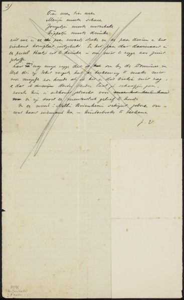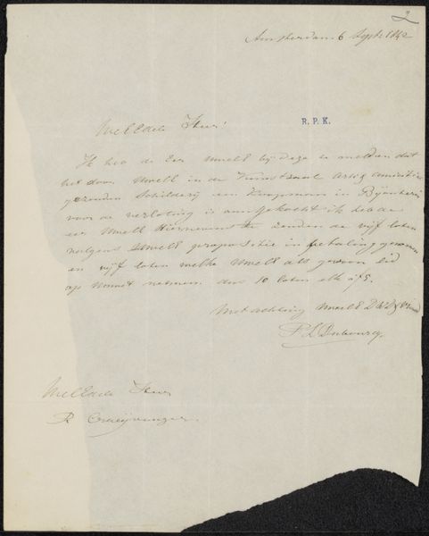 Curator: This is a letter penned by Cornelis Gerrit Verburgh, probably around 1833, entitled "Brief aan Christiaan Kramm." It’s currently held at the Rijksmuseum. We can see it was created with ink on paper. Editor: Immediately, the letter evokes a sense of intimacy and delicate communication. The faded ink and aged paper carry a weight of personal history. I imagine holding a conversation right now where things unsaid are as weighty as things said. Curator: Absolutely. The use of handwritten script during this period also conveys a great deal about the author’s social standing. Handwriting was carefully taught to young children during the eighteenth century. If done beautifully and meticulously, you’d be trained in specific penmanship. Editor: Looking at the loops and flourishes in Verburgh's script, I detect a certain flourish typical of the Romantic era, an attention to graceful expression but within quite rigorous rules, suggesting both control and passion operating together. What specific details signal it as Romantic? Curator: Well, consider that romanticism as a movement pushed back on institutional structure and thought during the 18th century and started to privilege expression of feeling. While this letter does concern mundane practicalities, Verburgh expresses his concern for Christian Kramm. You might wonder what these references or gestures signify socially or professionally? Is Verburgh trying to appear sensitive? Or, is the reference genuinely intimate? It's these questions about identity and purpose that interest me. Editor: I am quite drawn to Verburgh's stylized signature, the flourish underneath it reminds me of the natural world. A vine growing organically, it speaks to natural human expression while also rooted within cultural values of politeness. Curator: The history embedded within such a personal artifact really brings the era alive, doesn't it? The very act of communication has this direct and quite lovely connection through time, right to this instant! Editor: I agree. It's fascinating how a seemingly simple document like this, through careful attention, reveals such layers of history, and psychology, as we see the hand of a specific individual working through the social and cultural expectations of his time.