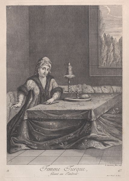 Jean Baptiste Vanmour created this print, "Femme Persienne," as part of a series documenting different nations of the Levant. The composition centers on a standing Persian woman, her figure framed by heavy drapes and a low divan. Note how the engraver used dense, cross-hatched lines to define the textures of fabrics, contrasting with the smoother surfaces of skin and stone. The structural organization guides our reading of cultural signs. The woman’s gesture, drawing attention to her hand, could signify a specific cultural practice, a mode of communication, or an assertion of identity. The figure in the background, attending to a smoking apparatus, introduces a narrative element, hinting at domestic rituals or social hierarchies. Consider how Vanmour's technique presents the ‘Orient’. Is this a faithful record or a constructed image filtered through European conventions? The print invites us to consider how cultural representation operates, challenging fixed notions of East and West.