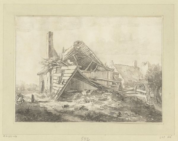 Arnoldus Johannes Eymer created this sketch, "Schuur met rieten dak" or "Barn with thatched roof", with pencil on paper. What immediately strikes you is the textural contrast. The thatched roof, rendered with a dense network of fine lines, sits atop the rougher, more angular structure of the barn itself. This contrast invites a semiotic reading, where the roof might represent a kind of organic, enveloping shelter, while the barn is a more assertive, constructed space. The composition leads our eye in a zig-zag pattern to the right, destabilizing any sense of conventional perspective. Eymer seems less interested in representing reality than in exploring the visual language of form and line. The sketch challenges fixed notions of space and representation, offering instead a dynamic interplay of visual elements.