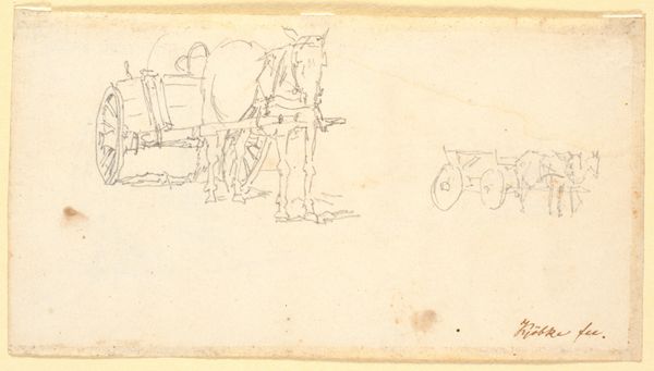 Christen Købke made this study of horse-drawn carts using graphite on paper sometime in the first half of the 19th century. The immediacy of the medium, a simple pencil, allows for quick sketching and the capturing of fleeting moments. Look closely, and you'll see how Købke used line weight to suggest the forms of the carts and the animals pulling them. The texture of the paper itself adds another dimension, providing a subtle background for the artist's marks. What's interesting here is the subject matter: working vehicles, tools of labor. Købke elevates the everyday, finding beauty and interest in the objects that would have been essential to the Danish economy at the time. It reminds us that art doesn't always have to depict grand historical events or idealized scenes; it can also find meaning in the mundane realities of working life.