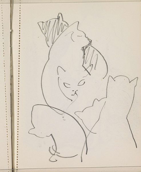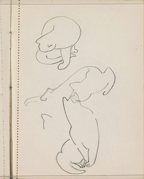 Curator: Reijer Stolk's work, "Kip en koppen van een kip," translating to "Chicken and Heads of a Chicken," resides here at the Rijksmuseum. We believe it was created sometime between 1906 and 1945. It's a fascinating study in pencil and ink. Editor: My initial response is that it's remarkably sparse. The lines are delicate, almost tentative. There is a certain vulnerability here; a kind of simplicity. Curator: Absolutely. When you look closely at the materiality of the sketch, one has to consider its value as a study piece rather than a polished work. You can see the artist exploring form, particularly the anatomy of the chicken, through very economical lines. Consider the cost of paper, pencils, ink... Resources affect what and how artists work. Editor: That sparseness also resonates with socio-political readings. A chicken might represent domesticity, sustenance, the everyday… Yet rendered in such an almost ephemeral style, one can argue that it challenges traditional portrayals of women in domestic environments during the first half of the 20th century. A critique perhaps. Curator: That's an intriguing reading. I’m drawn to the actual making; the hand of the artist evident in the tentative lines, the corrections and the revisions all contributing to a fascinating insight to the making of the artwork, its creation. What does it mean for it to be unfinished? Editor: What does any representation mean if we don't question it? What realities is it obscuring through its selection of details, techniques and themes. We’ve barely touched the politics of gender. Curator: Exactly, the artist isn't presenting us with a completed, packaged narrative, but inviting us into a conversation. Its humble material elements speak to a specific way of making which becomes so integral to the narrative it holds. Editor: Agreed. This unassuming sketch allows for an important reflection on societal structures that is essential for our moment.