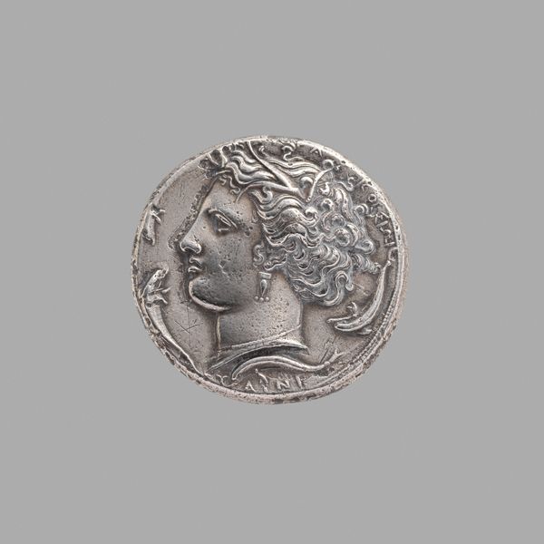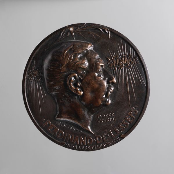 Curator: Looking at this plaquette by Johan Melchior Faddegon from 1902, what captures your eye first? Editor: Well, immediately, it’s that resolute profile and the cool, silvery surface of the metal. It feels almost… icy. Curator: Precisely. The plaquette, which is essentially a type of commemorative medal made of metal, presents a portrait of Queen Wilhelmina. The bordering script is written in Arabic; that was commissioned on the occasion of the Queen’s coronation in 1898 to mark her authority in the Dutch East Indies. Editor: Authority certainly seems to be the keyword. The crown, that unwavering gaze... but, doesn’t it feel slightly...distant? Cold, as I said? Curator: Perhaps. Wilhelmina’s image here is crafted to project a certain image of Dutch royalty, which also reflects the anxieties around the monarchy, colonialism, and international affairs at that time. Note how Faddegon's modern style subtly diverges from traditional regal portraiture, but it remains dignified. Editor: Interesting point. So, this wasn't just about a pretty picture for the monarchy; there's a socio-political strategy embedded. And what about the object itself, as a piece of metal, almost like a coin? Curator: The medium heightens the message, definitely. As a smaller, reproducible sculpture, the plaque had wide circulation, unlike many monumental portrait busts from earlier monarchies, helping build an imagined community throughout the Netherlands and its colonial sphere. Editor: Almost a proto-photograph then in its ability to spread the monarch’s likeness. Thinking of the artist's intent, what kind of feelings about the Dutch Empire were meant to come through, do you think? Was it a simple image of benevolent colonial rule, or did they recognize that there were more troubling aspects to colonialism? Curator: Oh, I doubt the royal family wanted to acknowledge the latter. Though Faddegon's subtle design choices introduce elements of doubt, highlighting both the strength and perhaps the fragility of power. It is never simple with power, right? Editor: Right you are. Now when I look at that distant gaze of Queen Wilhelmina, it makes me feel all kinds of contradictory things about what was happening in the world then and how we remember it now. It certainly takes more than a single royal image to settle such disputes. Curator: Yes. And Faddegon’s elegant metal portrait certainly speaks volumes, prompting reflection on monarchy and its impact. It's history in our hands.