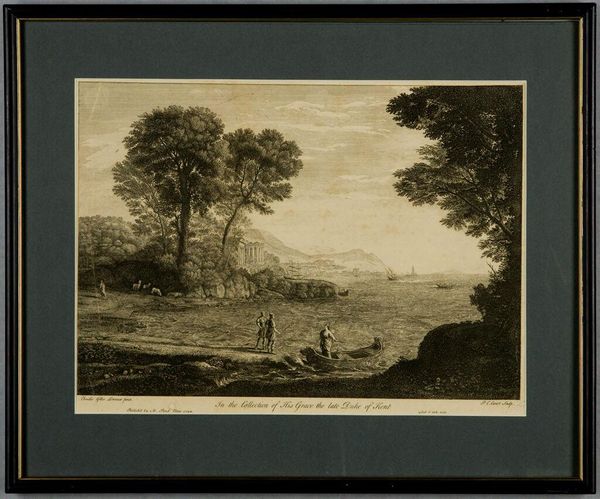Curator: This is “Landscape” by François Vivares, currently residing here at the Harvard Art Museums. Editor: Mmm, it feels like a quiet afternoon. That light, the way the trees frame the figures… very serene. Curator: Vivares was known for his landscape engravings, often after paintings by other artists. This evokes a kind of idealized rural life that was fashionable in the 18th century. Editor: Fashionable escapism, maybe? I wonder what those figures are chattering about, or dreaming about? It’s like a half-remembered pastoral dream. Curator: The placement of these figures creates a visual focal point within the broader landscape, but it’s also designed to speak to the cultural values of the era. Editor: Right, you look at this and you’re transported, even if it’s just for a stolen breath. It is good to see it after a long day.