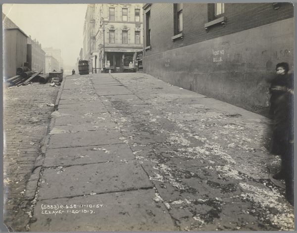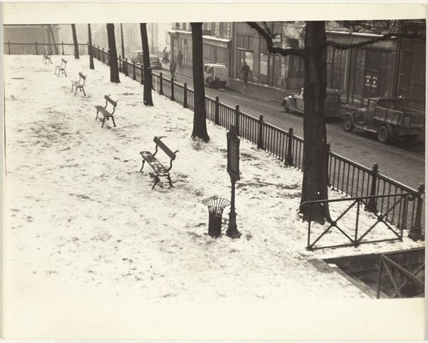 Curator: The gelatin-silver print before us, "Street scene, Paris," was captured by Robert Frank in 1951. I’m immediately drawn into its complex tapestry of symbols – reflections, blurred figures, and what appears to be an overflowing waste bin filled with flowers dominating the foreground. What catches your eye? Editor: Well, the overwhelming mood first. A melancholic charm, right? It feels gray and slightly damp. Like a film noir just starting its day, it is so evocative and really calls to mind the everyday lives in Paris in that era. I think, compositionally, it's the puddles reflecting everything – distorting, hinting. They feel very symbolic of perception itself. Curator: Puddles often signify a reflective state, a subconscious mirror. Frank’s deliberate use of light and shadow adds depth, visually but also, perhaps, metaphorically to represent duality. What appears broken on the surface may have untold hidden depths underneath, or maybe a deeper, more beautiful vision of what it shows, especially as the city around it transforms after the Second World War. I believe we see realism blending into modernism in the work's exploration of human psychology, using cityscapes, which, along with portraiture, make it stand out amongst street-photography from this period. Editor: Right. It's a realist street photograph of its era. We expect this; after all, these silver gelatin prints are created from actual photos and situations. I like that contrast because the people kind of vanish into this backdrop, this scene of Paris after the war. What remains – the trash overflowing, reflecting itself as art– really suggests themes of memory and presence. Curator: Indeed, that overflowing bin. Is it rejection or overflow of beauty? Perhaps it references art movements before Frank's time, or alludes to post-impressionism? This bin sits near what looks like a "Metro" sign, adding cultural context – the lifeblood of the city churning nearby, even if partially obscured. The symbols within photography offer narratives of transformation in cultural contexts. Editor: And how those flowers sit beneath this really prominent tree that frames the shot; to me, the tree seems protective, a kind of watchful guardian. So, there is something about finding poetry amid decay, the beautiful amid the broken, and even that, ultimately, in service to transformation of a society in art. Curator: A keen observation! Well, considering this discussion of the visual elements and possible meaning of Street Scene, Paris, I appreciate more fully how such still imagery evokes time, emotions, and the potential for interpretation. Editor: For me, this experience offers an invitation into rediscovering magic hidden inside mundane spaces.