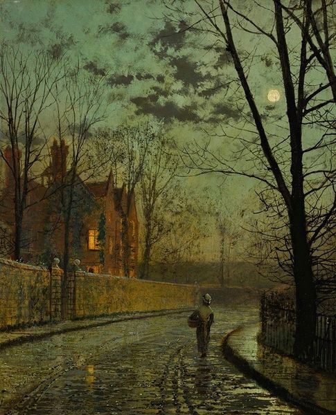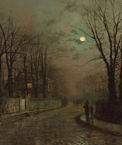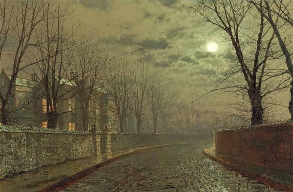 John Atkinson Grimshaw created "The Turn of the Road" during an era defined by the industrial revolution and Victorian ideals. His nocturnal scenes offer us a glimpse into a society grappling with rapid change and social stratification. Grimshaw's commitment to capturing the atmospheric effects of moonlight and gaslight invites us to consider the cultural significance of illumination during this period. Gaslight, a symbol of modernity and progress, also cast shadows, creating a world of stark contrasts. In "The Turn of the Road" how are we to read the glow of the windows of a grand house? Is this a depiction of safety and warmth, or a symbol of exclusion and inaccessibility? Consider the lone figure walking on the road. Are they passing through a space that is not their own? Grimshaw often explored themes of memory, nostalgia, and the passage of time. "The Turn of the Road" captures a moment frozen in time, inviting us to contemplate the complex relationship between the past, present, and future.