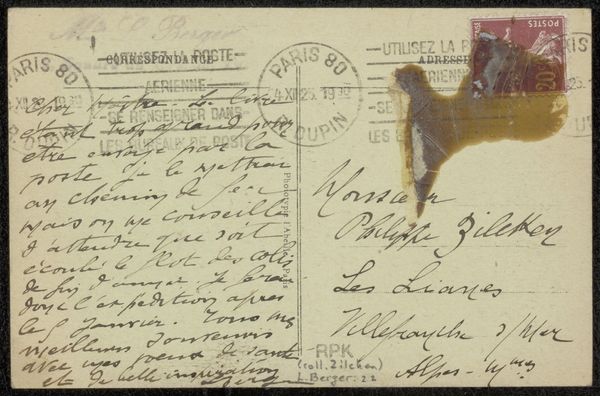Curator: Here, we have a glimpse into the past through a "Prentbriefkaart aan Philip Zilcken," a postcard, created with pen and ink on paper sometime before 1924. It seems simple enough at first glance, but I immediately pick up on the weight of personal correspondence of that era, the tactile quality of handwriting. Editor: It is, undeniably, quite intimate, isn’t it? Seeing this makes me think of access, or the limitations thereof. Who had the privilege of sending such missives, and to whom? How might such forms of communication reinforce or challenge social boundaries in the period between the wars? It reminds me of how profoundly everyday modes of interaction shape cultural narratives. Curator: Absolutely. Postcards themselves represent a specific cultural phenomenon, especially given their use by the leisured class at that time. This card likely carries layers of meaning concerning travel and social standing, reflecting power dynamics of its time. Editor: And the text! While it looks almost nonchalant, it invites interrogation. "Cher amis..." What intimacy is performative and what reflects real bonds? Even the selection of the medium becomes significant, does it not? A quickly jotted postcard holds an entirely different register of social commitment than a formal letter. The immediacy seems performative in some respects. Curator: We also have to consider the institutional frameworks at play – how the postal service itself influenced interpersonal exchanges. Consider also that ‘Edition Tairraz, Nice’ at the bottom left may speak to how a growing tourist industry intersected with art and correspondence. Editor: What implications might that have for our understanding of this postcard? The act of reducing relationships into consumable, replicable greetings also raises essential questions concerning commodification. Looking closely at such seemingly insignificant objects becomes important to reveal a matrix of social influences, to subvert accepted historical narratives and to offer fresh, inclusive meanings. Curator: It's a delicate balance – finding the broader social resonance in such personal artifacts. This glimpse provides that bridge between personal stories and larger institutional and cultural shifts. Editor: Agreed. This postcard encapsulates how even simple personal gestures become potent sources to reveal larger societal tensions. I think what moves me most is how tangible a feeling comes through this small slice of life, from almost a century ago.