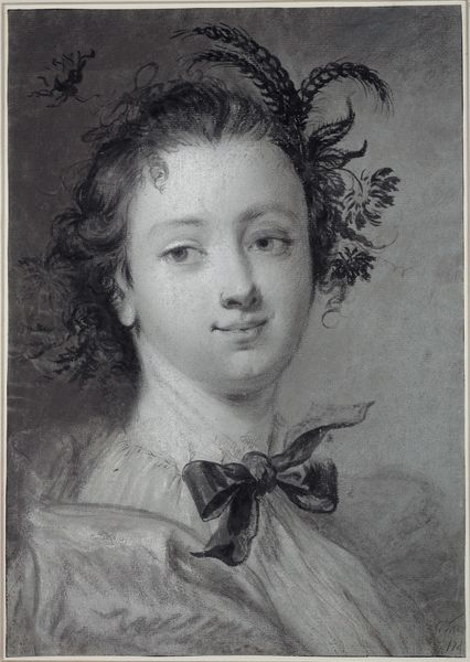 Curator: She seems very poised, a little coy maybe, but overall just breathtaking. It’s like catching a glimpse into a secret garden. Editor: You’ve zeroed right in on that fleeting feeling! What we’re looking at here is Louis Marin Bonnet’s "Head of Flora", etched sometime in 1769. Curator: "Flora" eh? So not just a pretty face. How interesting. Beyond her beauty, she seems to represent ideas of youth and Spring, even beauty. This archetypal woman adorned with flora embodies a specific time; maybe even a set of values. Editor: Precisely! The Rococo style, deeply embedded in French culture, favoured themes like this— celebrating love, nature, and aristocratic leisure. Her direct gaze breaks with convention; it's unusually engaging. It speaks to the dawn of the Romantic movement where inner feelings were given external expression. Curator: What's striking to me is the color work achieved through etching. The delicacy feels distinctly feminine but that isn’t entirely positive. How can it claim connection to history when there’s such an obvious sense of privilege imbued within? Editor: It does straddle this line, doesn’t it? The sweetness can easily become saccharine, which reflects a key tension within Rococo art. And yes, it very much serves a patron class. But etching here, though reproductive in function, allows for subtle tonal modulations, elevating what could have been just a pretty picture into something far more… delicate. The romantic movement adopted the delicate femininity portrayed here while completely eschewing those displays of power and privilege that once lay beneath them. Curator: Indeed, looking again, the softness of the etching captures a particular type of ethereal beauty— the kind that acknowledges its own fragility. So much history within a single artwork. It’s fascinating. Editor: Agreed! It makes me think about the endurance of certain archetypes and what it means to return to those again and again. I guess it just goes to show what is captured at that perfect moment, even in art, has resonance through the ages.