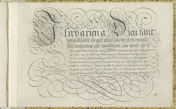 Lieven Willemsz. Coppenol made this calligraphic writing sample with ink on paper. The supple character of these materials is essential to the work's effect. It is literally graphic, demonstrating the artist’s mastery of line. The skill of a calligrapher was highly valued in the 17th century, when handwriting was not only a means of communication, but also a performative craft. Think of it as a kind of manual printing. These highly skilled practitioners were in demand to produce legal documents, transcribe literary works, and create formal presentation texts. The labor and time involved in such commissions made them valuable commodities, and the artistry evident here elevated handwriting to the level of fine art. Coppenol was a master of his medium, demonstrating that even the most functional of art forms could be a vehicle for personal expression and artistry. This challenges conventional distinctions between craft and fine art.