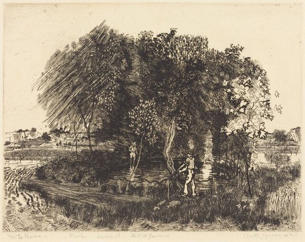 Editor: Auguste-Louis Lepère's "Return from the Market," a print from 1911, captures a bustling scene with figures traversing a landscape. I find the atmospheric perspective created with the etching technique quite compelling, but I'm curious about how it speaks to its historical context. What do you see in this piece in terms of its social commentary? Curator: It's interesting that you picked up on the atmosphere. Beyond just aesthetic appeal, consider the public role of images like this at the turn of the century. Lepère was deeply engaged with documenting Parisian life and the lives of working-class people in the French countryside. Notice the figures pushing heavily laden carts, the posture of the laboring man by the ditch; Lepère presents them with a certain dignity, but within a system that demands so much. What do you think this image communicated to its initial audience about labor and urban life? Editor: I guess I hadn’t considered how the print medium makes it more accessible, potentially spreading a particular view of these workers more widely. So, rather than just documenting, it's almost advocating for recognition of their efforts? Curator: Precisely. The medium of print facilitated a wider dissemination of social observations, subtly shaping public opinion. Consider also the institutional framework; prints were collected and exhibited, influencing tastes and conveying specific socio-political narratives. Where do you think this print may have been displayed, and who might have been its intended audience? Editor: Possibly in smaller galleries, targeting a middle-class audience interested in modern life, but maybe with a touch of romanticism too? This has definitely reshaped how I see it – from a nice landscape to a potential statement about social classes! Curator: Exactly. Looking at art through this lens can transform your understanding, seeing beyond the aesthetic to its role within society. Editor: Absolutely! I'll be sure to look at art with this historical perspective moving forward.