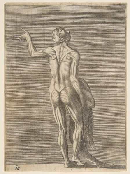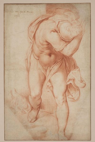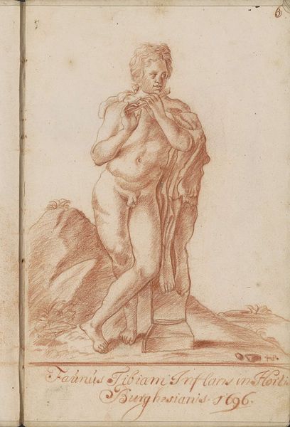 Editor: So here we have "Woman in a Toga with a Jug on her Head," a pencil drawing from 1696 by Hendrick van Beaumont. I'm immediately struck by the figure's pose – it feels very deliberate, almost like a sculptural study. What catches your eye? Curator: Immediately, the rendering of form. Notice how van Beaumont utilizes hatching and cross-hatching to build volume and delineate the figure’s drapery. The tonal gradations, achieved purely through variations in pencil pressure, are remarkably sophisticated. Do you observe how this technique contributes to a sense of classical idealism? Editor: I do. It feels very… academic. Like he's studying classical sculpture. But what about the red chalk? Does the medium affect how we perceive the work? Curator: The red chalk, or sanguine, lends a warmth and vitality absent in pure graphite drawings. Its inherent earthiness subtly undermines the idealized form, grounding the figure in a palpable reality. Observe how it interacts with the paper’s texture, creating a subtly dynamic surface. The artist skillfully manipulates a limited palette to suggest both weight and movement. Do you see how the draping of the toga directs the eye? Editor: Yes, from the jug on her head down to her feet. There’s definitely a sense of motion. So, it’s not just about representing a figure, but also about using the medium and composition to create a feeling. Curator: Precisely. The beauty lies in the inherent qualities and arrangement of its elements. The relationship between line, tone, and texture creates a formal harmony, a self-contained system of visual meaning. Editor: I see. It's a focused approach! This gives me a completely different lens through which to examine artwork. Curator: And it gives us another set of possibilities to appreciate artistic interpretation and skill.