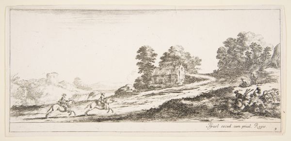 Curator: Looking at "Gezicht op het oude ziekenhuis van Görlitz," an etching by Christoph Nathe from sometime between 1763 and 1806, one is immediately struck by the delicate intricacy of the scene. Editor: It's so ethereal. It feels like peering into a half-remembered dream, all soft edges and quiet observation. It's beautiful, but carries a definite sense of melancholy with it. Curator: It's interesting you say that. From a historical standpoint, the representation of the old hospital isn't just a benign landscape. Hospitals, especially then, were sites of immense social significance, acting as symbols for everything from charity to societal neglect. Editor: So it's not just a pretty scene of a building nestled in nature; it's about all of that—the weight of those societal expectations and realities bearing down on that place. You know, I noticed the two figures in the foreground now, and they almost seem burdened. Are they walking toward or away from that institution, I wonder. Curator: That's exactly the kind of reading I encourage! Considering Nathe was working during a period of social and political upheaval, we might ask how the architectural form of the hospital and its positioning within the landscape comment on public health or welfare. Its location outside of town almost gives the sense that there's a visual sense of quarantining. Editor: Almost like a separation—visible, yet somewhat removed. Art is incredible that way. You come looking for what is tangible in plain sight, only to discover there are far deeper undertones lingering. Curator: Absolutely. It provides so much to reflect on about the attitudes of the era. These kinds of images could influence public perception or spark discourse surrounding such institutions. Editor: Well, my perception is that Nathe's created an artwork with far greater historical depths than this amateur eye ever would've guessed. Curator: Agreed. His technical finesse coupled with a sensitive exploration of spatial relationships makes for an emotionally resonant piece of social commentary.