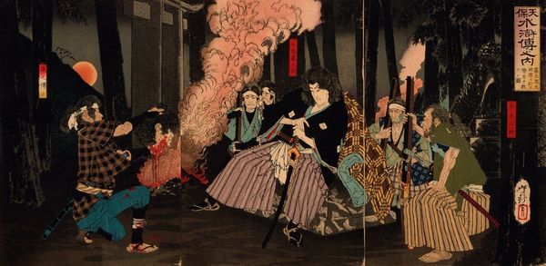 Tsukioka Yoshitoshi's woodblock print presents us with a scene dominated by dynamic movement and formal contrasts. The artist uses bold lines and vivid colors to capture a moment of intense action, likely portraying a historical event. The composition is structured by a strong horizontal flow. The eye is drawn from left to right, following the march of the figures. Yoshitoshi’s use of perspective, although somewhat stylized, creates a sense of depth, positioning the viewer within the unfolding scene. The artist plays with patterns, from the striped clothing to the textured foliage in the background. These elements do not merely depict reality but serve to heighten the visual drama, emphasizing the chaotic energy. Yoshitoshi challenges conventional representations, offering a complex narrative that resists simple interpretation. Through the interplay of form and content, the artwork invites us to reflect on the themes of conflict, resilience, and the human condition. The woodblock print acts as a cultural artifact, reflecting broader artistic and philosophical concerns.
