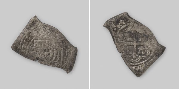 Curator: This fascinating piece is a Spanish eight-real coin, dating from 1732. It was minted in Mexico and remarkably recovered from the wreckage of the Dutch East India Company ship, the 't Vliegend Hart. Editor: Immediately striking is the coin’s somewhat brutal, almost primal appearance. Its irregular, almost rhomboid shape clashes with what one usually associates with coinage. The metallic sheen, aged by its maritime history, emits an aura of the baroque era from which it hails. Curator: Absolutely, the baroque stylistic features are evident not in its shape, but rather in the detailed heraldic symbols on each side. We see the Spanish coat of arms – a powerful statement of imperial authority stamped right onto the metal. Considering it was aboard a Dutch vessel, there is irony embedded. Editor: Yes, and from a purely formal perspective, observe how the coin’s crude shape draws more attention to these stamped designs; they seem less ornamental and more functional. These symbols carry weight as tools of societal inscription and speak more robustly from a deliberately flawed plane. Curator: Indeed. The recovery of this coin from a shipwreck also shapes its current presentation. Its journey across the ocean floor has impacted its material presence; seawater corrosion is evident. What were the politics around Dutch/Spanish relations, the context within which we interpret an object? Editor: Excellent points. That leads me to thinking if a more rounded version were to present itself to us here and now, would it not be more...sterile in essence? And so to contextualize this piece within current socio-political climates allows for renewed interrogation into currency value, function and validity of colonial symbolization. Curator: And the journey that this piece undertook aboard 't Vliegend Hart connects us to questions about Dutch and Spanish trade relations, colonialism, and global maritime history. These all combine to shape the coin’s cultural biography. Editor: Precisely! Thus we have moved between objecthood as cultural document of empire and more formally as a physical thing; and that liminality speaks of larger socio-political shifts occurring across cultural networks within that era.