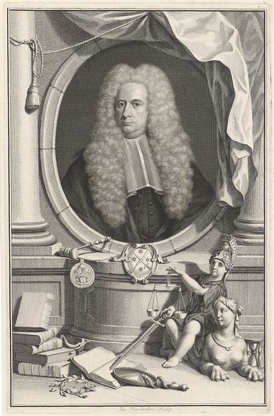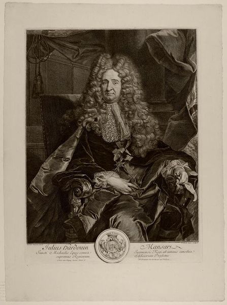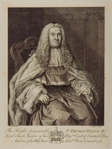 Curator: This is Robert Dunkarton's print of Henry Addington. Editor: Heavy is the head that wears the wig, eh? The formality is almost suffocating, even in monochrome. Curator: The weight of office is definitely palpable. Addington was a significant political figure, and the robes and setting—note the architecture in the background, a suggestion of Parliament—emphasize his status. These elements are meant to convey authority. Editor: Authority, yes, but also something else… vulnerability, maybe? He seems slightly overwhelmed by it all. The light catches his face in a way that softens him, cuts through the pomp. Curator: Perhaps it’s a reminder that even the most powerful figures are still human. Dunkarton captured a moment that transcends mere representation, a glimpse into the psyche beneath the symbols. Editor: Makes you wonder about the stories etched in the faces behind the portraits in our own time.